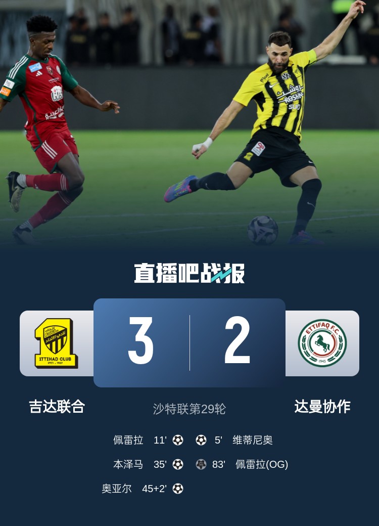 本泽马传射建功,吉达联合3-2逆转达曼协作6分领跑。