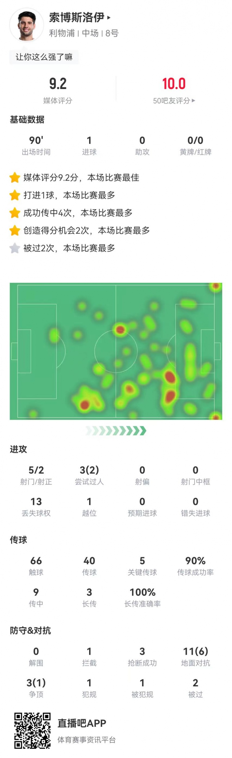 当之无愧!索博斯洛伊当选对阵热刺一役利物浦队内最佳球员