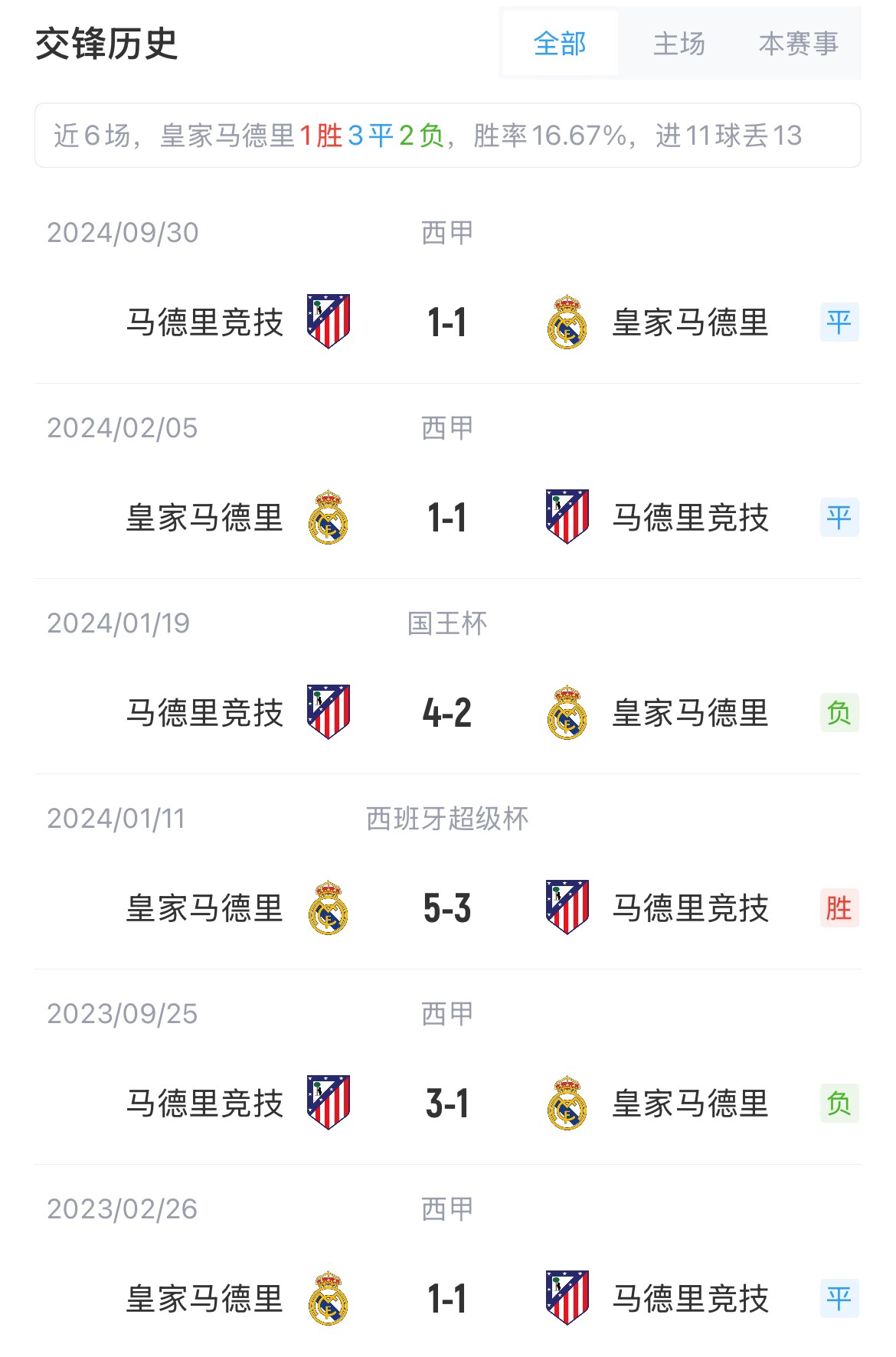 皇马目前以49分排名西甲榜首,马竞48分排在第二。赛季的首次交手中,皇马客场1-1战平马竞。