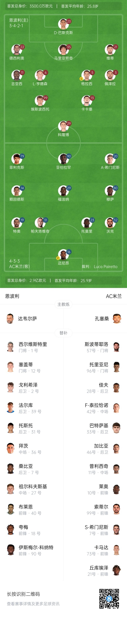 恩波利替补:1-西尔维斯特利、12-塞盖蒂、2-戈利希泽、39-法尔库、31-托斯托、36-拜茨、7-桑比亚、27-祖尔科夫斯基、40-布莱恩、18-夸梅、90-伊斯梅尔-科纳特