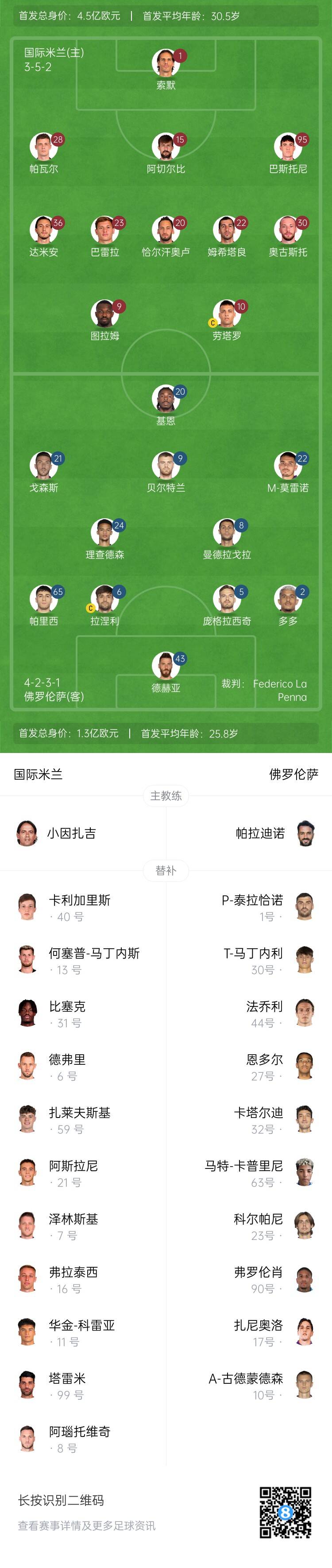 国米首发:1-索默、28-帕瓦尔、15-阿切尔比、95-巴斯托尼、36-达米安、23-巴雷拉、20-恰尔汗奥卢、22-姆希塔良、30-奥古斯托、9-小图拉姆、10-劳塔罗