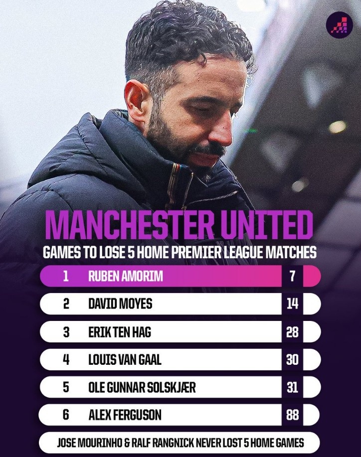 阿莫林执教曼联7个英超主场输5场,穆里尼奥执教下从未输掉5场 2月3日讯 在本轮英超,曼联0-2不敌水晶宫,阿莫林执教球队7个英超主场输掉5场。OPTA也盘点了曼联主帅执教球队输掉前5个英超主场用时,阿莫林最快,穆里尼奥、朗尼克执教下从未输掉5个主场,具体如下: 2025/02/03