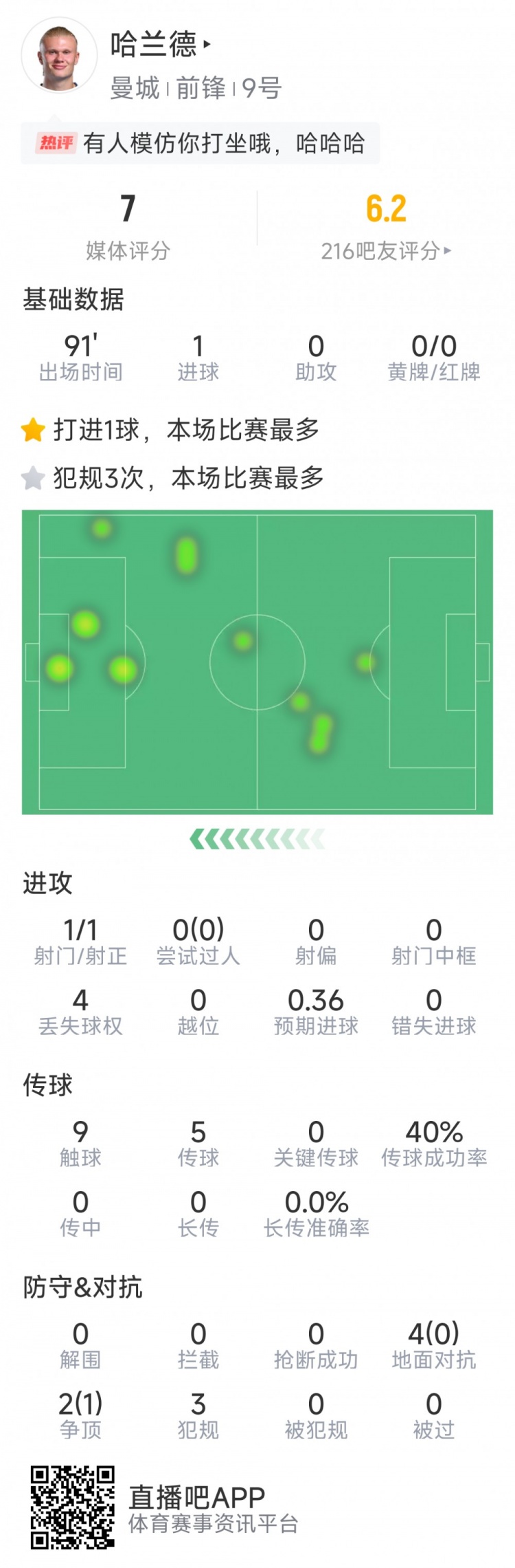 疑似上场!哈兰德半场:仅触球6次,射门过人等挂零,犯规1次 2月3日讯 本轮英超焦点战,曼城客战阿森纳。半场战罢,曼城暂时0-1落后对手。上半场,哈兰德参与感不强,一共只触球6次。哈兰德半场主要数据↓触球:6丢失球权:3传球:3传球成功率:33.3%射门:0射 2025/02/03