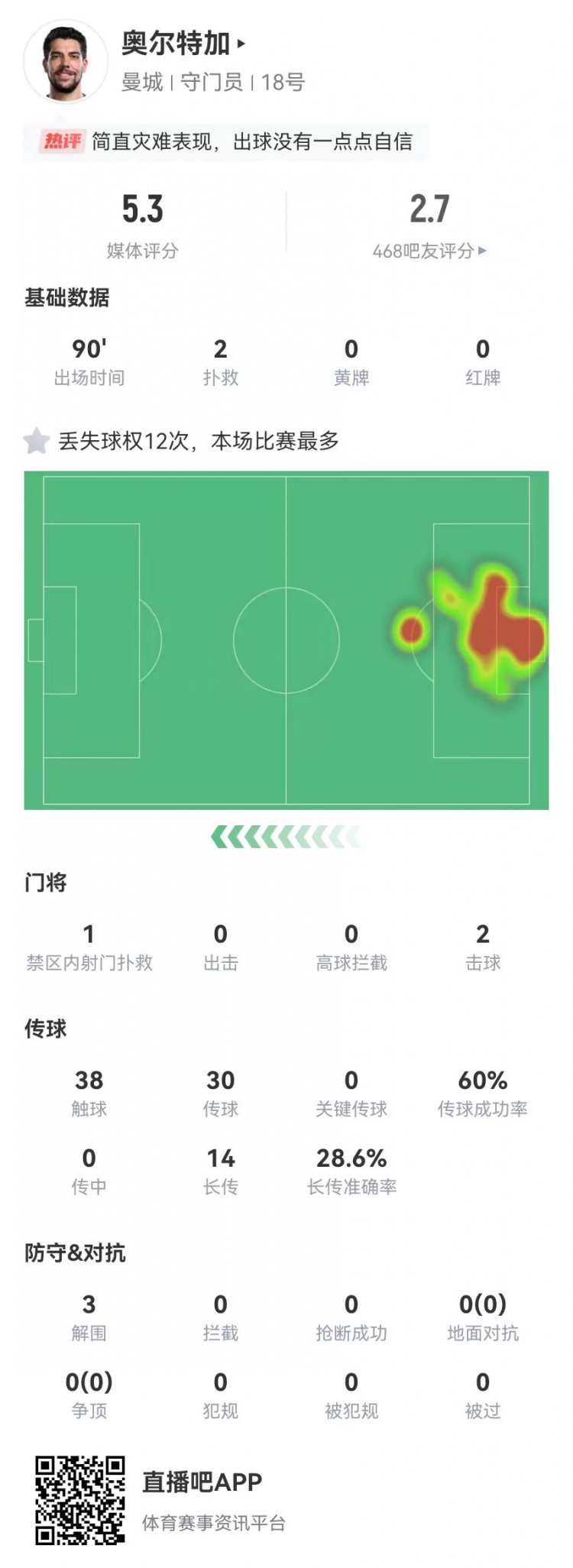 奥尔特加本场2扑救 预期扑出-2.11球 1失误致丢球 5.3分全场最低 2月3日讯 曼城在本轮英超1-5惨败阿森纳,奥尔特加本场数据如下:首发踢满全场2扑救、1扑救禁区内射门预期扑出-2.11球(门将若正常发挥应该是正值)2拳击球1失误导致丢球38触球30传球、18成功, 2025/02/03