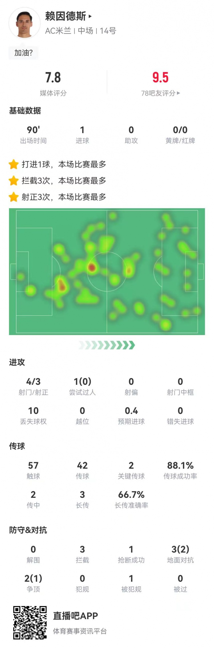 赖因德斯本场4射3正进1球 2关键传球+3拦截 获评7.8分全队最高 2月3日讯 米兰在本轮意甲1-1战平国米,赖因德斯本场数据如下:出场90分钟1球预期进球0.4057触球42传球、37成功,成功率88%2关键传球2传中、0成功3长传、2成功4射门、3射正1过人、0成 2025/02/03