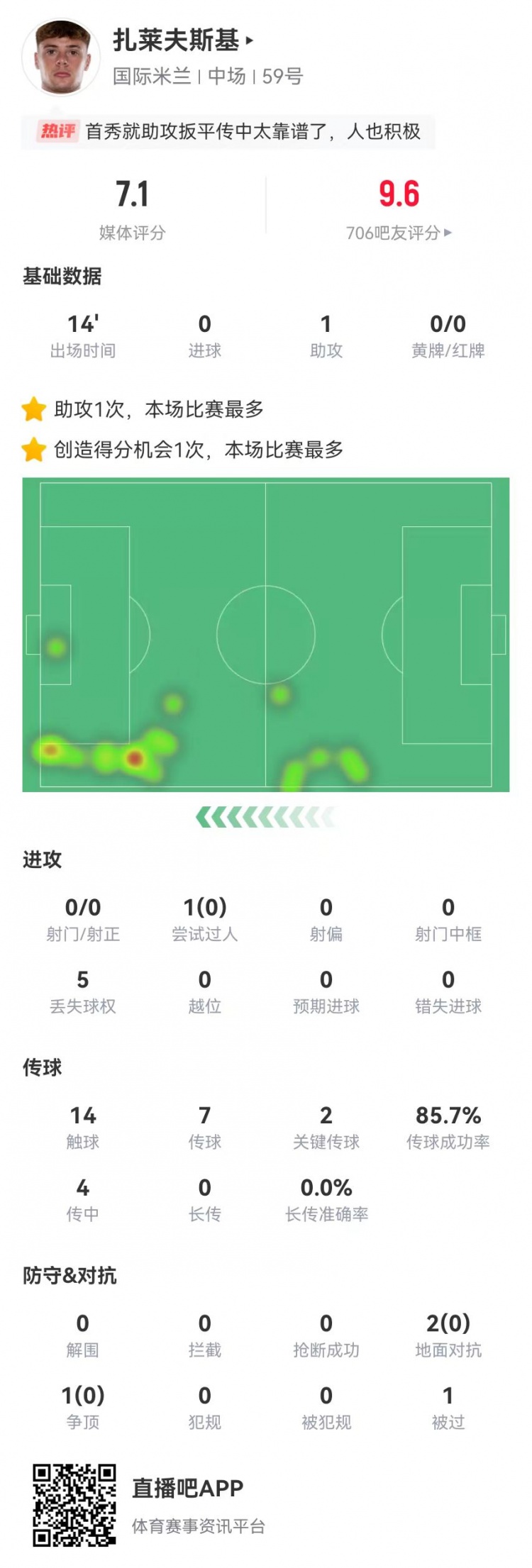首秀送助攻!扎莱夫斯基本场替补1助攻+2关键传球 获评7.1分 2月3日讯 国米在本轮意甲1-1战平米兰,扎莱夫斯基首秀数据如下:替补出战14分钟1助攻预期助攻值0.8314触球7传球、6成功2关键传球4传中、2成功1创造重大机会1过人、0成功3对抗、0成功5丢失 2025/02/03