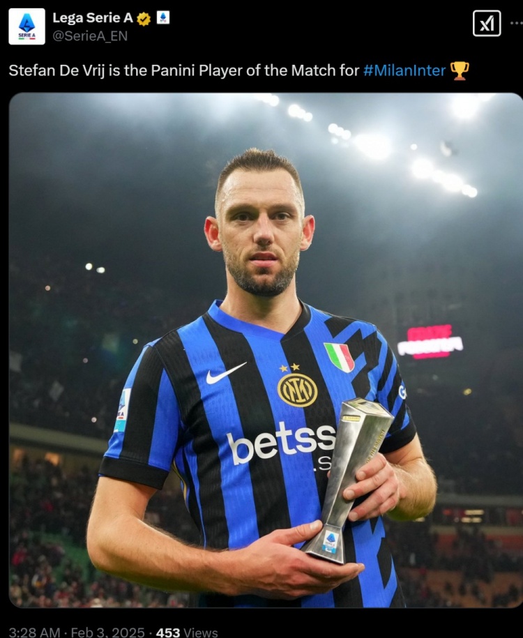 打进绝平球!意甲官方:德弗里当选国米1-1米兰全场最佳球员 2月3日讯 刚刚结束的米兰德比中,国米1-1绝平米兰。赛后,打入绝平进球的德弗里当选全场最佳球员。本场比赛中,德弗里2次射门1次射正便打进1球,他1次过人成功,传球成功率高达95.9%。在防守端,德弗 2025/02/03