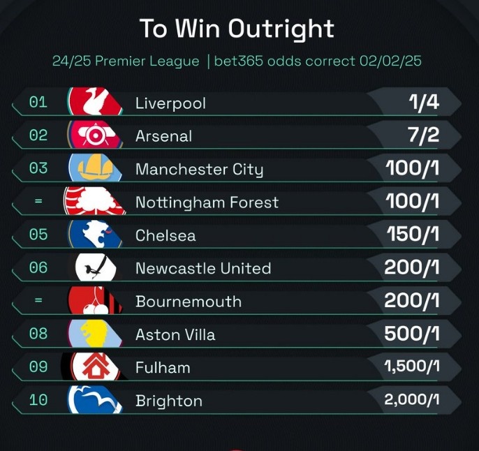 英超最新夺冠赔率:利物浦高居榜首,阿森纳次席&与曼城差距拉大 2月3日讯 在本轮英超,阿森纳5-1大胜曼城。在最新的本赛季英超夺冠赔率中,利物浦仍居首,利物浦、阿森纳已经遥遥领先并列第三的曼城,具体如下:1、利物浦 1/42、阿森纳 7/23、曼城 100/1= 2025/02/03