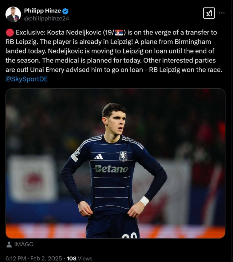 记者:莱比锡即将租借维拉19岁边卫内德伊科维奇,球员今天体检 2月2日讯 据德国天空体育记者Philipp Hinze独家消息,莱比锡接近签下维拉的后卫小将内德伊科维奇,其他有意的球队已经退出竞争。目前,球员已经乘坐飞机从伯明翰抵达了莱比锡。内德伊科维奇将以租借 2025/02/02