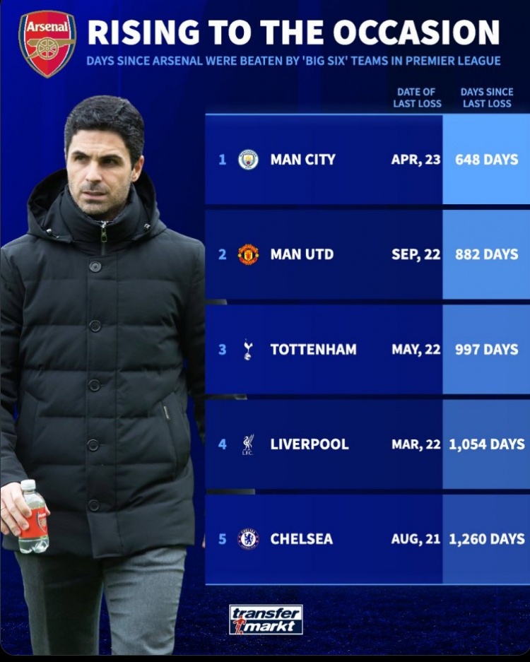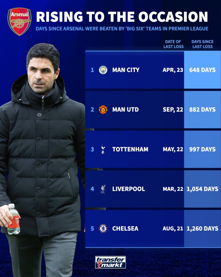 阿森纳上一次在英超对其他Big6输球还在648天前,对手正是曼城 2月2日讯 本轮英超将迎来阿森纳与曼城的焦点对决。据统计,阿森纳上一次在英超输给其他Big6球队还在23年4月,当时的对手正是曼城。以下为阿森纳在英超上一次输给其他big6球队的时间以及相隔天数:vs 2025/02/02