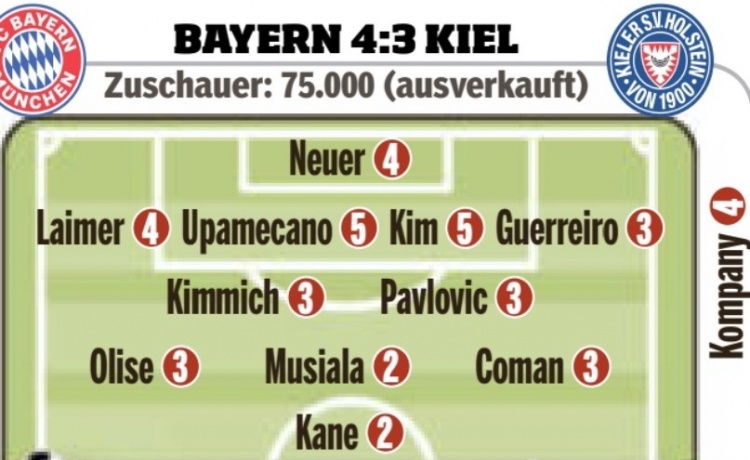 图片报拜仁赛后评分:凯恩、穆西亚拉获好评,金玟哉、于帕最低分 2月2日讯 拜仁在本轮德甲4-3击败基尔,《图片报》对拜仁进行了赛后评分,金玟哉和于帕这对中卫组合双双获得最低评分。图片报拜仁赛后评分:1分最佳,5分最差孔帕尼4分:做出5处人员调整,回归4231阵型 2025/02/02